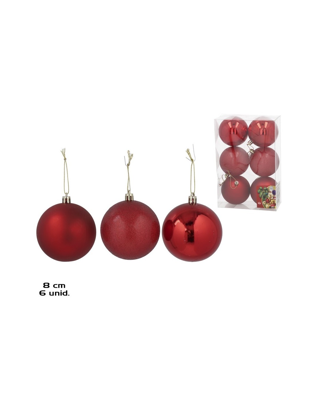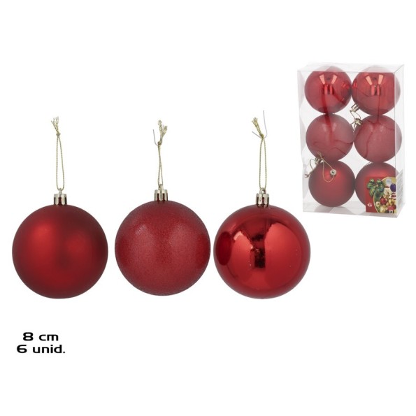 CAJA 6 BOLAS DE NAVIDAD ROJAS 8CM 3 SURT