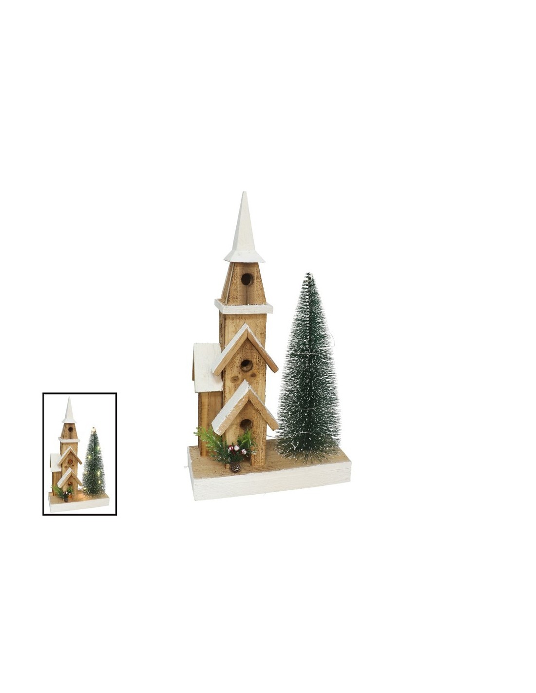 CASITA TEJADO NIEVE CON ARBOL 10 LUCES 42CM