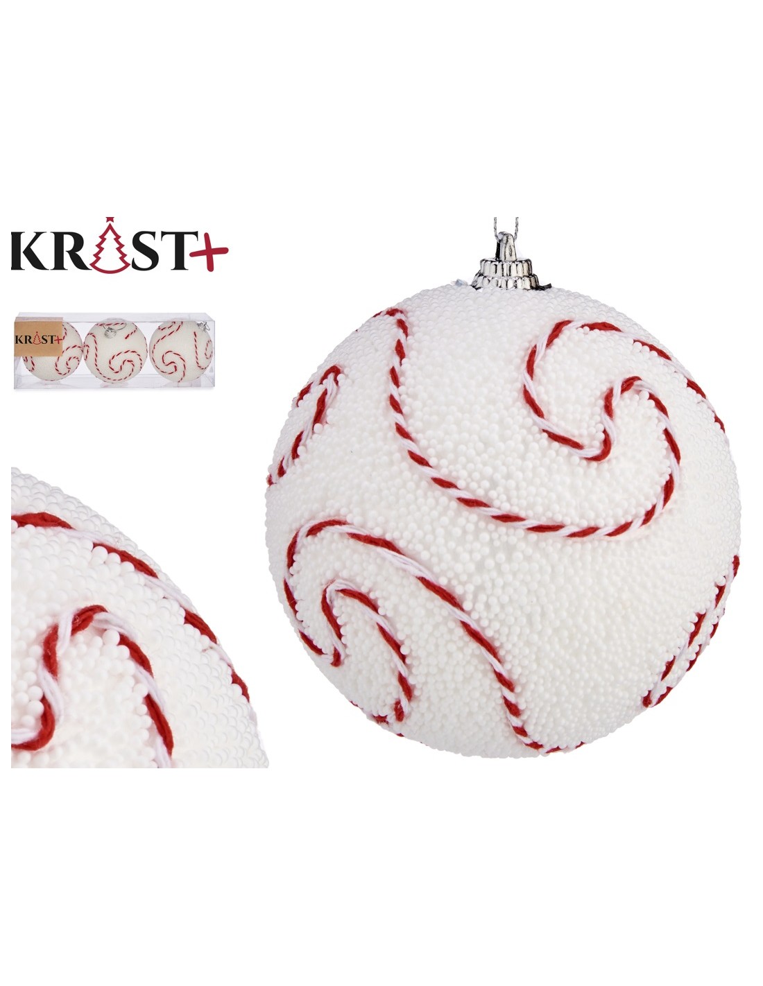 JGO 3 BOLAS NAVIDAD BLANCAS Y ESPIRALES ROJAS 8CM